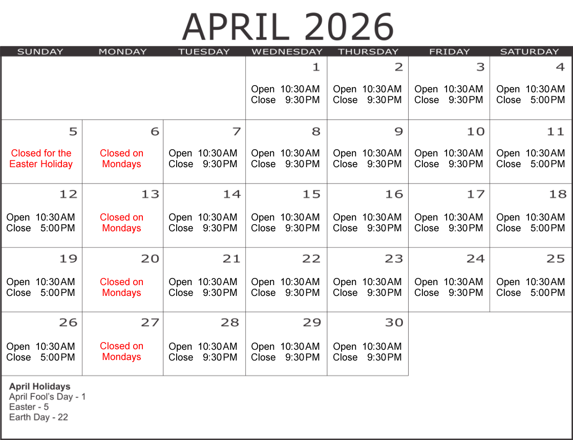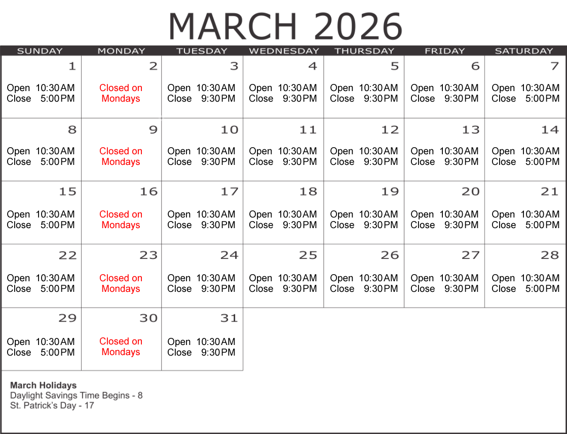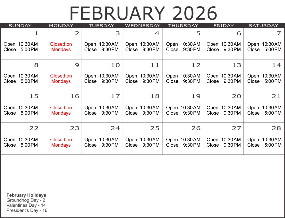 Hours may change due to inclement weather or conditions beyond our control.